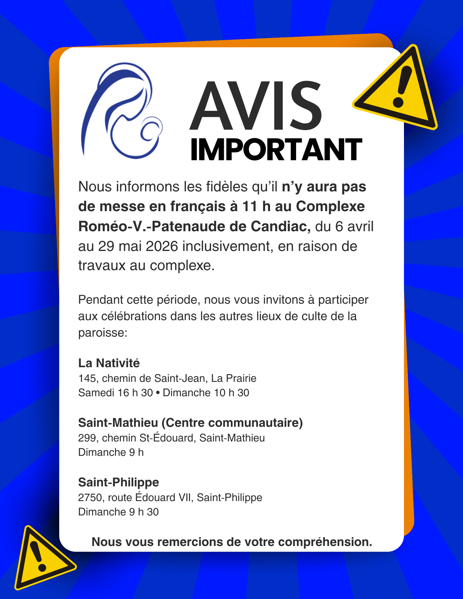 Bienvenue sur le site Internet de la paroisse La Nativité de la Sainte-Vierge. Vous y trouverez un aperçu des services offerts. Pour toute question ou suggestion, n’hésitez pas à communiquer avec nous.
